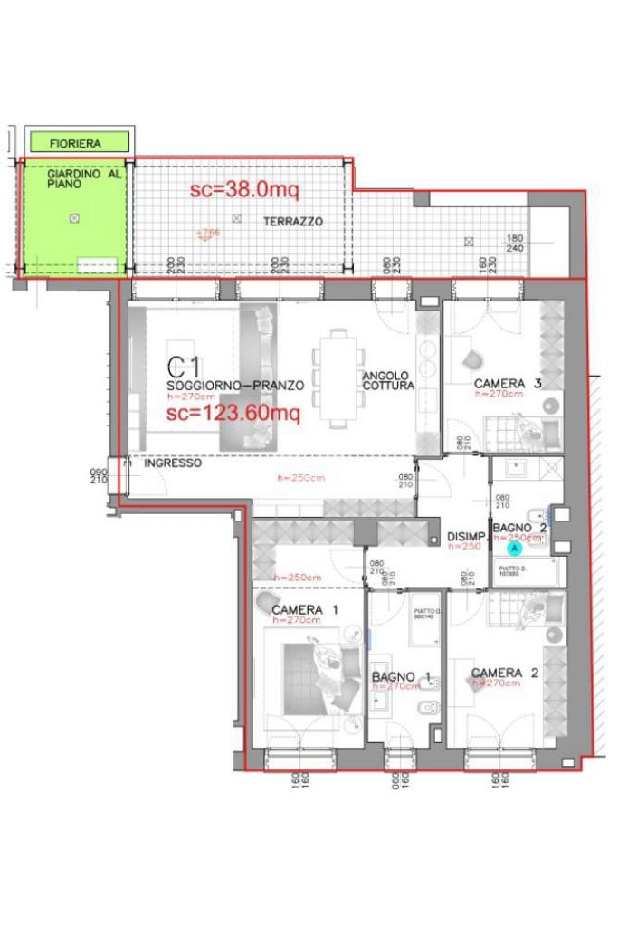 Il soggiorno accogliente si fonde armoniosamente con la cucina a vista, creando uno spazio ideale per intrattenere amici e famiglia. La camera matrimoniale e le due camere singole offrono un rifugio privato, mentre i doppi servizi aggiungono praticità al tuo quotidiano. Terrazzo di 30mq e Giardino Privato di 7mq: Vivere all'aria aperta!