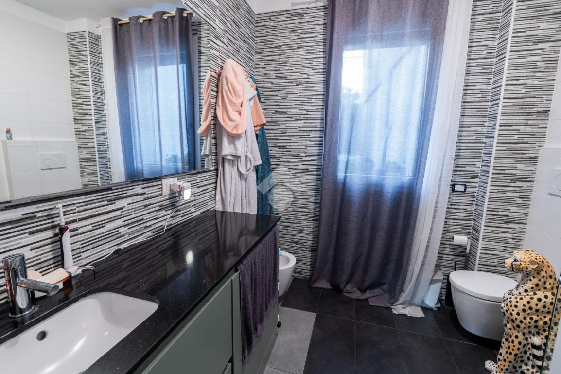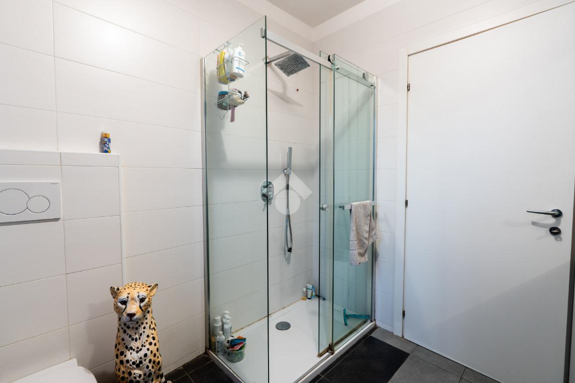 Il bagno è finestrato, dotato di ampia doccia e sanitari sospesi, con finiture moderne e funzionali. La camera da letto matrimoniale, ampia e ben distribuita, si affaccia sul secondo giardino privato esposto a ovest, uno spazio esterno ampio e riservato, completo di punto acqua, perfetto per momenti di relax all’aperto. Completano la proprietà cantina e box, inclusi nel prezzo. L’immobile è dotato di comfort e tecnologie moderne che garantiscono un elevato livello di qualità abitativa: il riscaldamento è a pavimento e centralizzato con contabilizzatori autonomi. Gli infissi sono dotati di vetrocamera, le tapparelle sono elettriche e la porta d’ingresso è blindata. È presente aria condizionata nella zona giorno e la predisposizione nella zona notte.